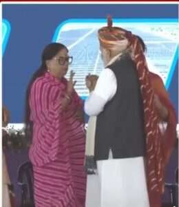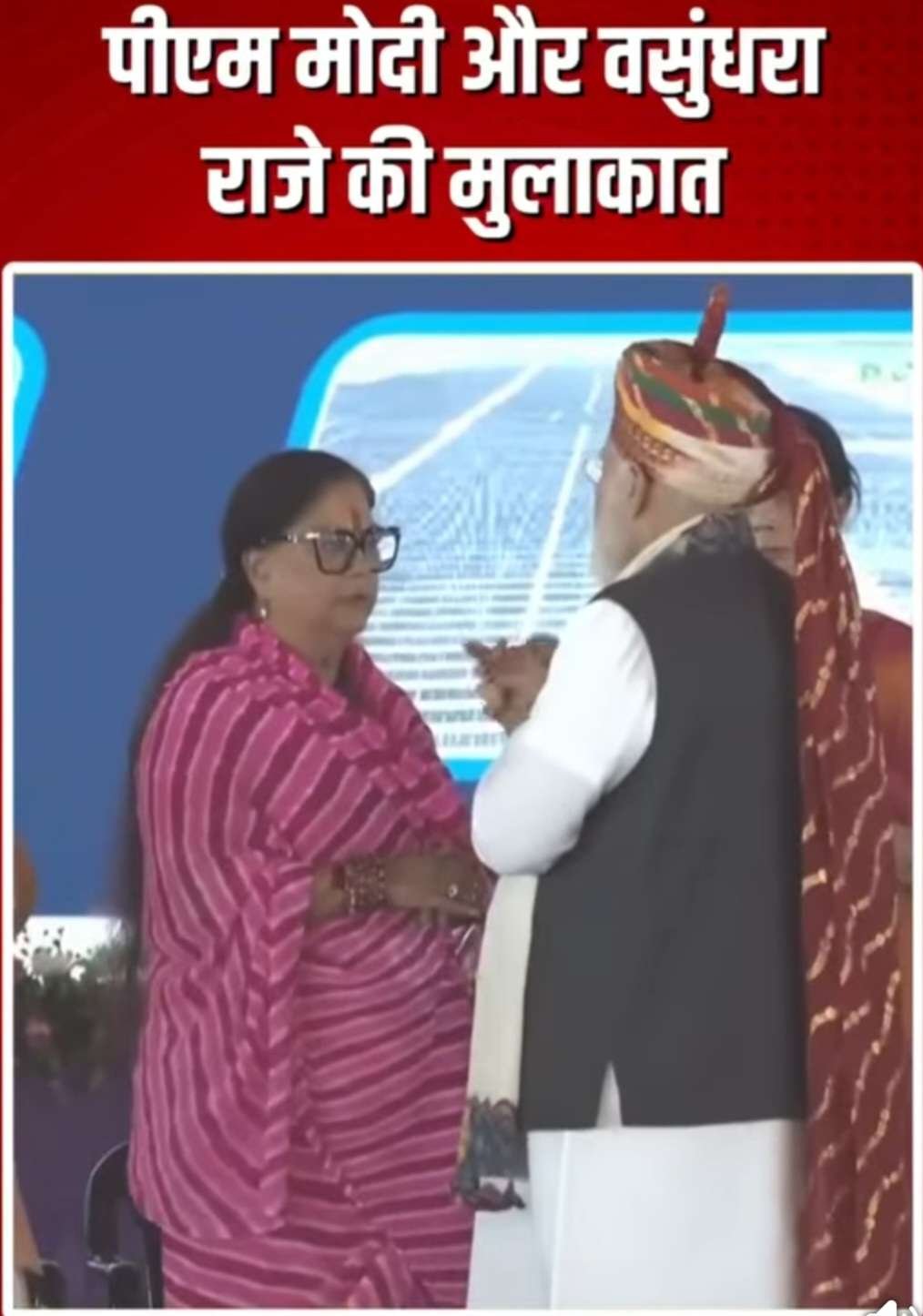 बांसवाड़ा। प्रधानमंत्री नरेंद्र मोदी के बांसवाड़ा दौरे के दौरान मंच पर एक दिलचस्प नज़ारा देखने को मिला। जब पीएम मोदी मंच पर पहुंचे तो वहां मौजूद सभी नेता हाथ जोड़कर खड़े नज़र आए, लेकिन पूर्व मुख्यमंत्री वसुंधरा राजे अपने अलग अंदाज में दिखाई दीं। मोदी हाथ जोड़कर अभिवादन कर रहे थे, जबकि राजे हाथ बांधे खड़ी रहीं।