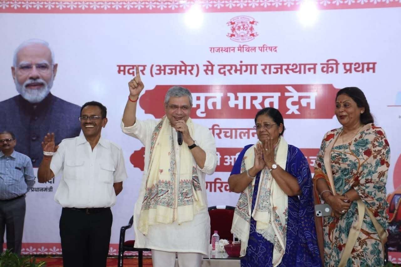 सांसद मंजू शर्मा ने सांगानेर स्थित राजस्थान मैथिल परिषद द्वारा मदार (अजमेर) से दरभंगा राजस्थान की प्रथम अमृत भारत ट्रेन के परिचालन “नागरिक अभिनंदन कार्यक्रम” में केंद्रीय रेल एवं सूचना व प्रसारण मंत्री अश्विनी वैष्णव का दरभंगा एक्सप्रेस के जयपुर में ठहराव करने पर आभार जताया।