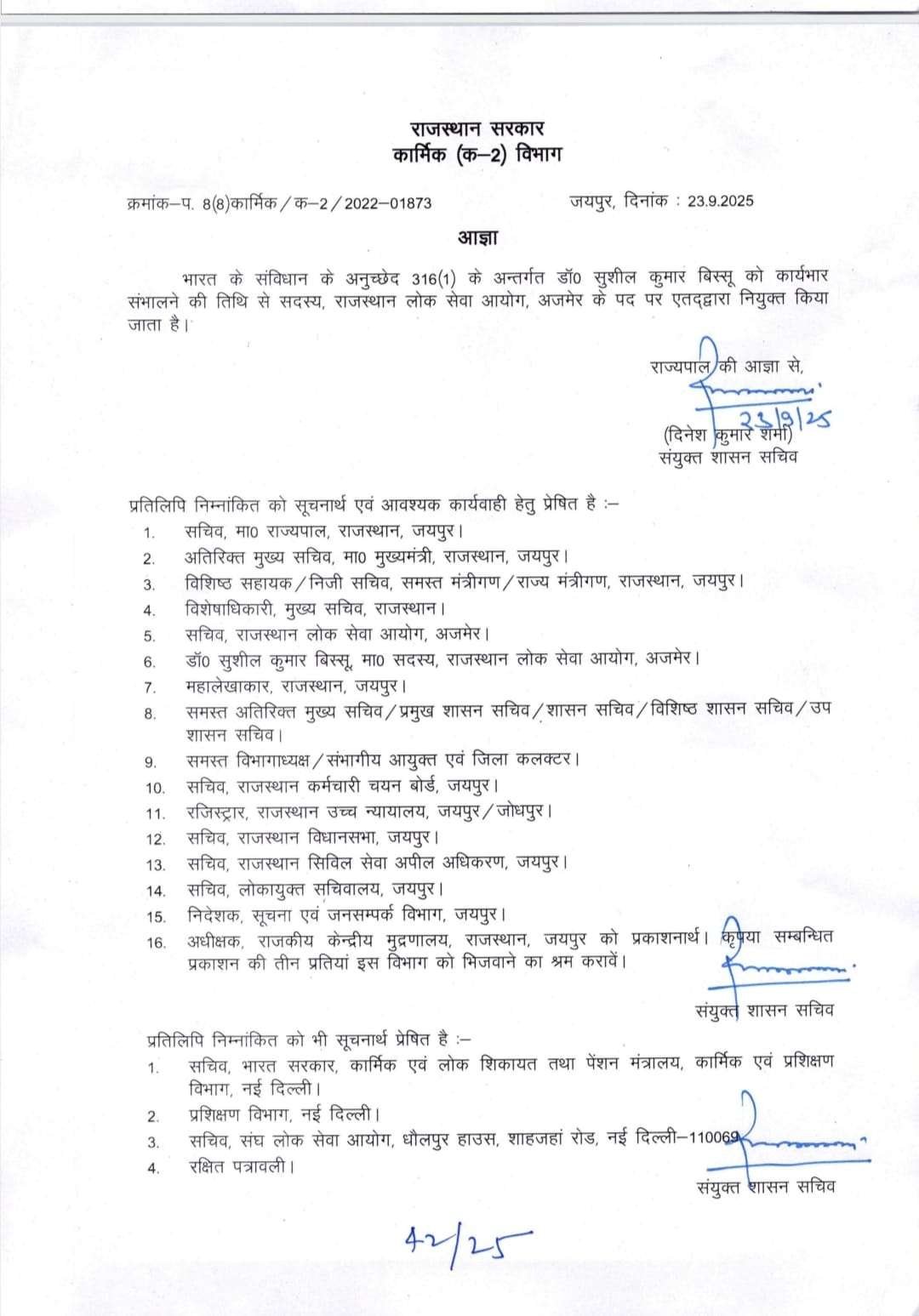 कार्मिक विभाग द्वारा जारी आदेश में कहा गया है कि ये नियुक्तियां राज्यपाल की मंजूरी के बाद प्रभावी होंगी।