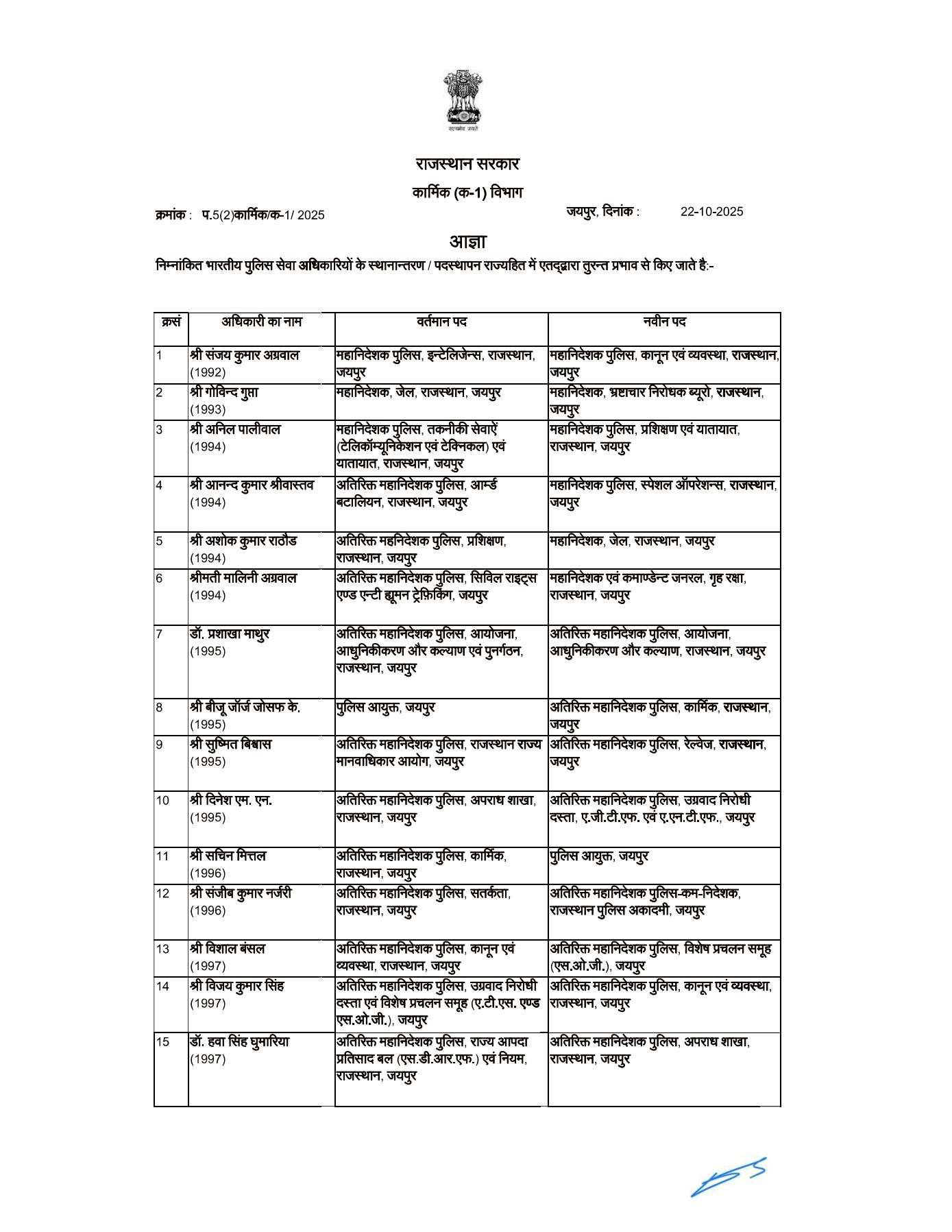 1. संजय कुमार अग्रवाल (1992) – महानिदेशक पुलिस (कानून व्यवस्था) को महानिदेशक पुलिस, इंटेलिजेंस, जयपुर का भी अतिरिक्त प्रभार।