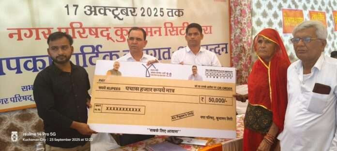 कुचामनसिटी। नगरपरिषद परिसर में मंगलवार को शहरी सेवा शिविर-2025 का आयोजन किया गया। वार्ड नंबर 09 और 10 के लिए आयोजित इस शिविर में आमजन की कई समस्याओं का समाधान किया गया और विभिन्न विभागों की सेवाएं उपलब्ध कराई गईं।