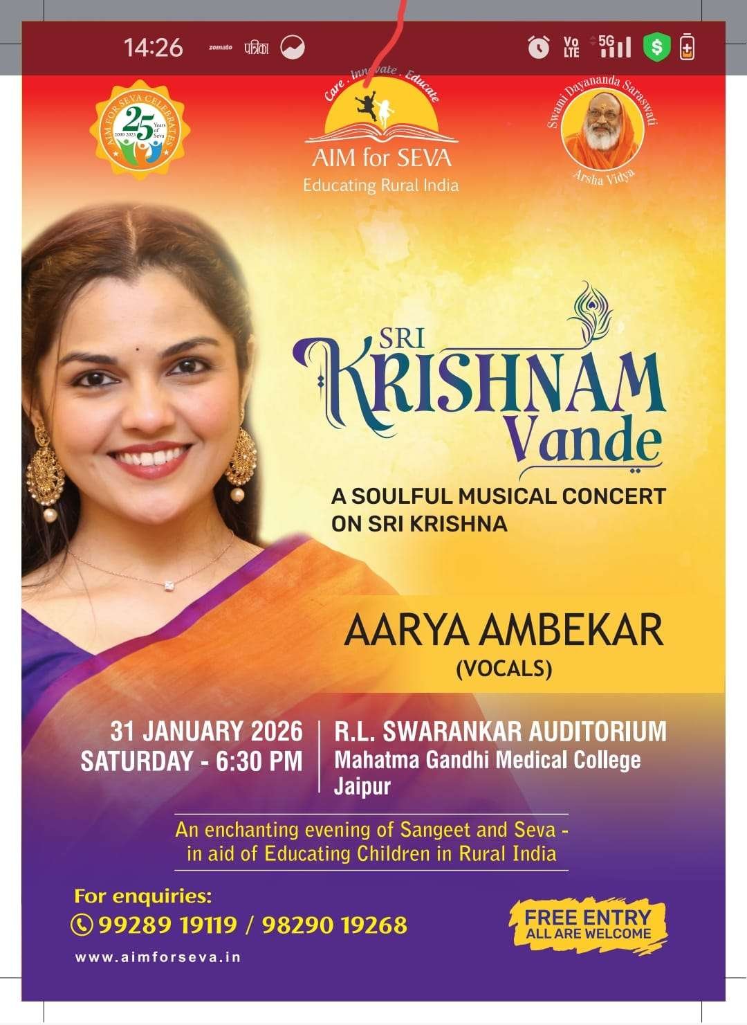 इस आध्यात्मिक संध्या में सुप्रसिद्ध शास्त्रीय गायिका आर्या अंबेकर श्रीकृष्ण भक्ति से ओत-प्रोत भजनों की प्रस्तुति देंगी। आयोजक स्वामी ब्रह्मपरानंद जी के अनुसार कार्यक्रम निःशुल्क एवं सार्वजनिक है तथा इसका उद्देश्य संगीत के माध्यम से ग्रामीण एवं वंचित बच्चों की शिक्षा के लिए जन-सहयोग को प्रोत्साहित करना है।