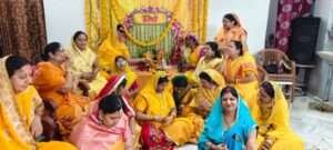 हाल ही में आयोजित हल्दी कार्यक्रम में महिलाओं ने पीले वस्त्र पहनकर पीले फूलों से गवर माता की पूजा की। इस दौरान भजन-कीर्तन और पुष्पवर्षा का विशेष आयोजन हुआ।